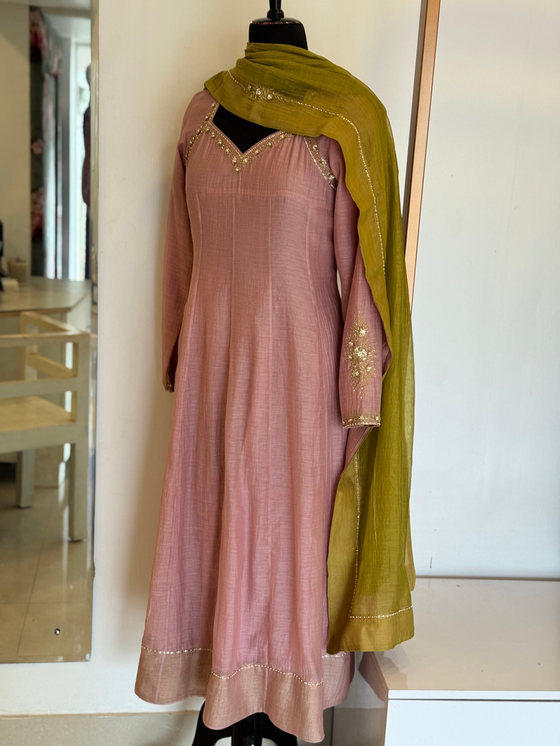 Make a statement with this stunning Mul Chanderi anarkali, paired with a contrasting dupatta that adds a pop of colour and elegance. The intricate texture of the chanderi fabric and the contrast dupatta create a regal look, perfect for special occasions. Paired with a santoon bottom this ensemble offers comfort and sophistication.